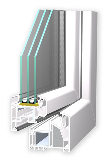 ❽ Mit einen 3-fach Wärmedämmglas (Abbildung) können in Verbindung mit Argon- oder Kryptonfüllung im Scheibenzwischenraum Ug-Werte von 0,6 bzw. 0,5 erzielt werden. Hierdurch werden die Anforderungen der aktuellen EnEv weit übertroffen.