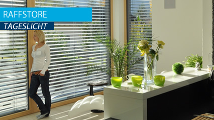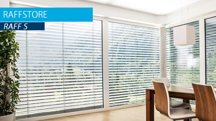 Unser RAFF S Raffstore mit RETROLux-Lamelle steht für die neue Dimension des Wohlbefindens. Denn er hält die Hitze draußen und lenkt zugleich wertvolles Tageslicht ins Rauminnere. |