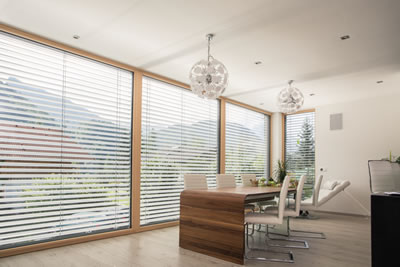 Hitzeschutz und Tageslichtlenkung gehen beim RETROLux Raffstore einher mit optimaler Durchsicht. Die kontinuierliche Änderung der Lamellenneigung über die Behanghöhe passt die Durchsicht den Anforderungen des Nutzers optimal an: Im oberen Behangteil liegen die Lamellen flacher und gewähren aus der Raumtiefe heraus eine sehr gute horizontale Durchsicht.